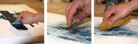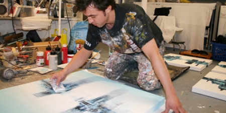 In aufwändigen Arbeitsprozessen trage ich Schicht für Schicht Farbe auf die Leinwand auf,